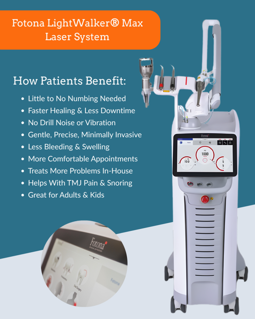 Our dental office is equipped with one of the most advanced dental laser systems available today: the Fotona LightWalker® Max. This dual-wavelength dental laser allows us to perform a wide range of treatments with exceptional comfort, precision, and faster healing.